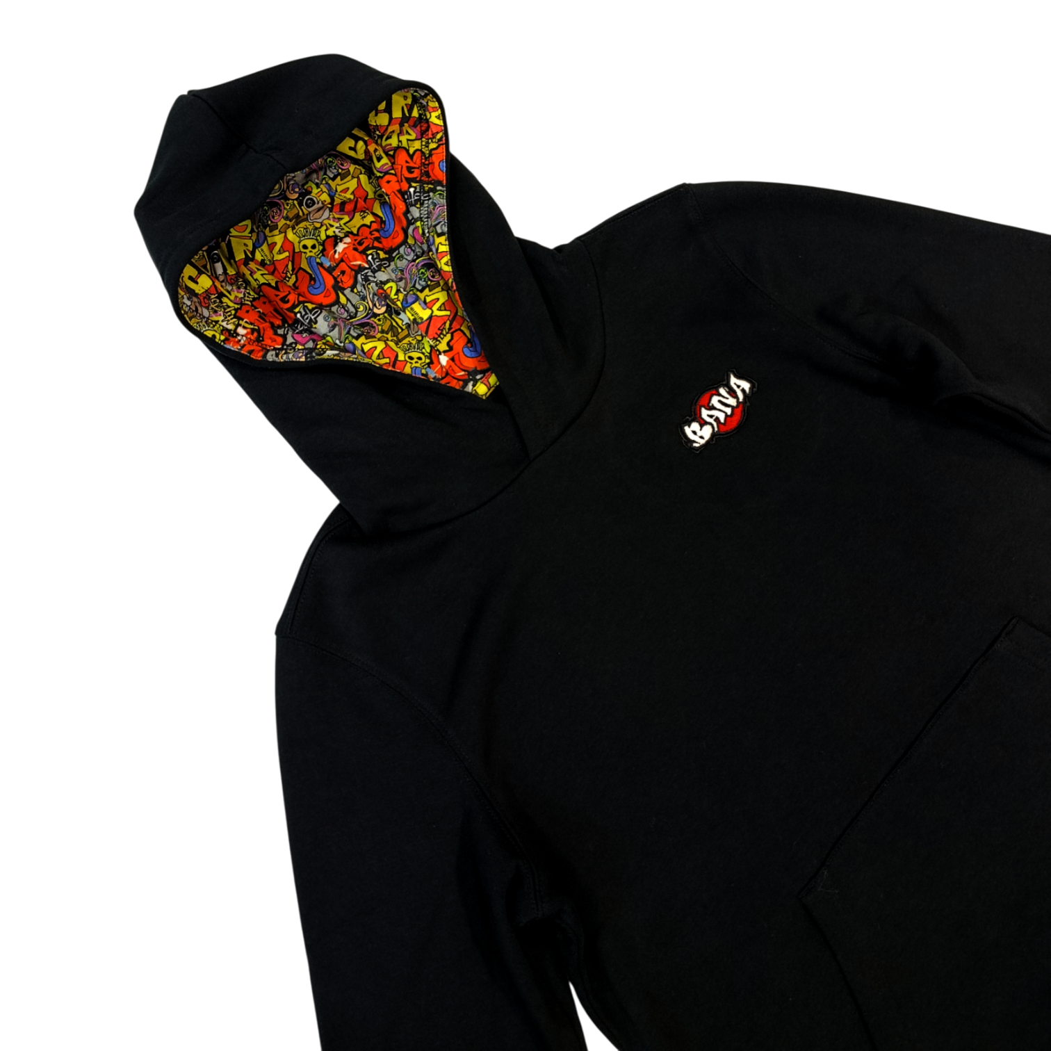 Explosão de Cores: O verdadeiro destaque está no forro do capuz, que revela uma estampa vibrante de graffiti, cheia de cores intensas e desenhos artísticos que contrastam perfeitamente com o tecido preto.