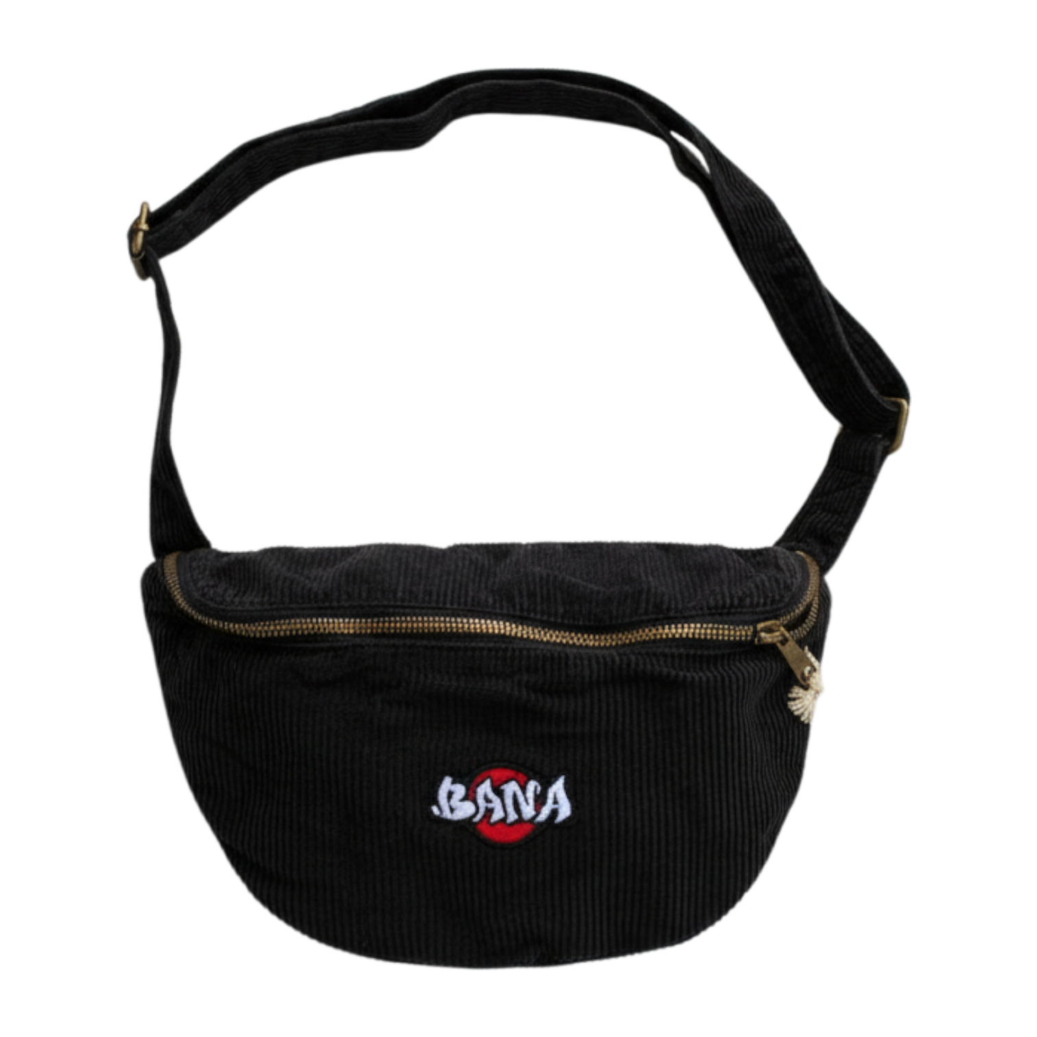 O fecho de correr em metal e a alça ajustável garantem praticidade, enquanto o patch redondo do logo BANA (vermelho e branco) bordado na frente assegura o toque de marca.