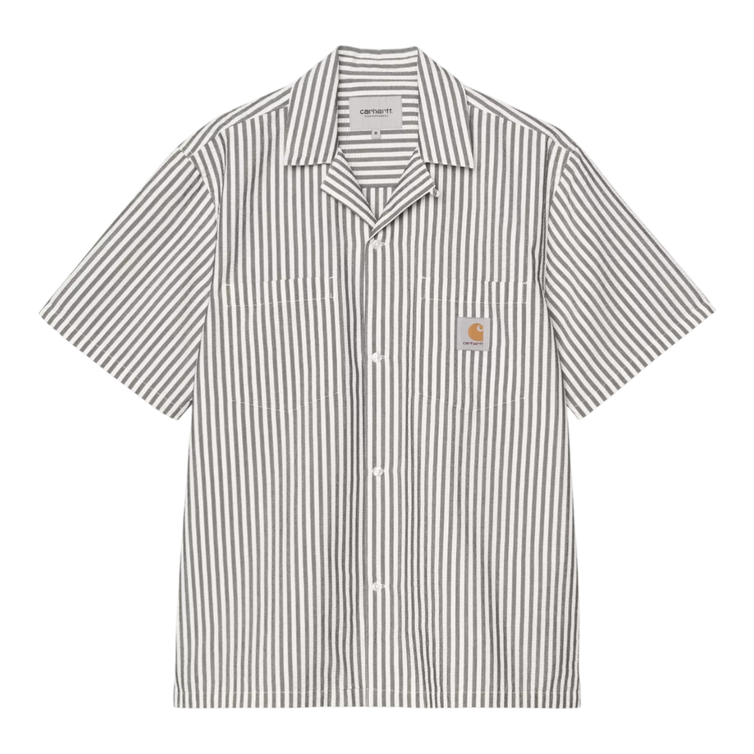 A camisa S/S Leavel Shirt, de corte solto, é confecionada em seersucker de poliéster e algodão texturizado de textura ligeira que foi submetido a um tratamento lavado para lhe conferir um tato mais suave. Tem uma etiqueta quadrada em tecido no bolso do peito.